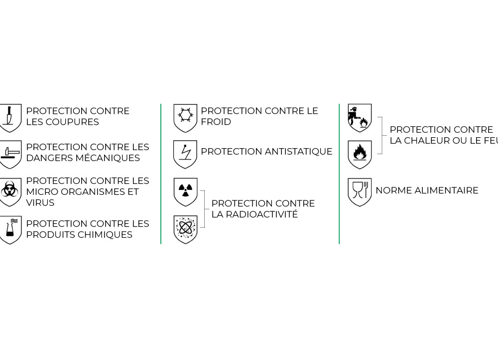 Afin de faciliter le choix de vos gants, vous pouvez vous repérer facilement avec ces pictogrammes se trouvant sur les boîtes d'emballage et les fiches techniques.