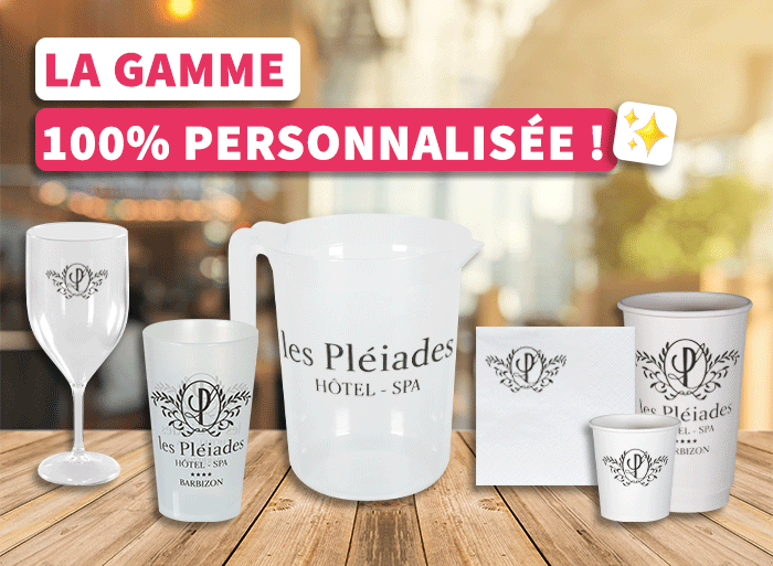 Nous sommes spécialistes de la personnalisation de produits. Vous trouverez donc sur notre site des gobelets réutilisables personnalisés, des gobelets en carton imprimés, des carafes ou pichets personnalisables, des sets de table en papier personnalisés, des serviettes en papier imprimées et bien plus encore.