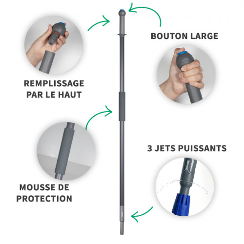 Appuyer sur le bouton en haut du manche pour expulser l'eau en 3 petits jets.