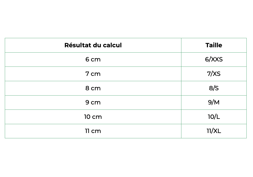 Exemple : largeur de la paume = 8 cm / longueur du majeur = 6 cm → (8+6)/2=7