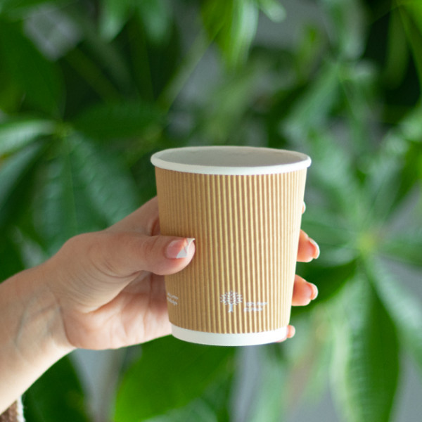 Ces gobelets jetables sont fabriqués à 100% en carton, ce qui signifie qu'ils ne contiennent aucun plastique. Cette information est précisée sur chaque gobelet avec la mention "100% carton, 0% plastique" (en français, anglais et espagnol) et leur aspect naturel est renforcé avec leur couleur kraft. Contrairement aux autres gobelets carton qui ont une pellicule en plastique à l'intérieur, ces derniers sont rendus imperméables grâce à un revêtement végétal fabriqué en pulpe de papier. De ce fait, ils sont totalement recyclables et sans plastique !