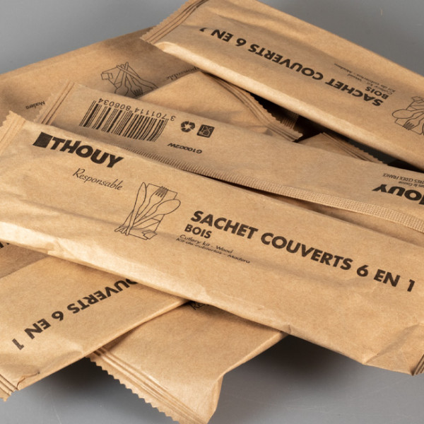 Dans chaque sachet, vous trouverez une fourchette, un couteau et une cuillère en bois ainsi qu’une serviette en papier 1 pli, un étui de sel et un de poivre. Ces sachets couverts sont fabriqués en papier kraft, ce qui en fait un kit 100% recyclable et compostable.